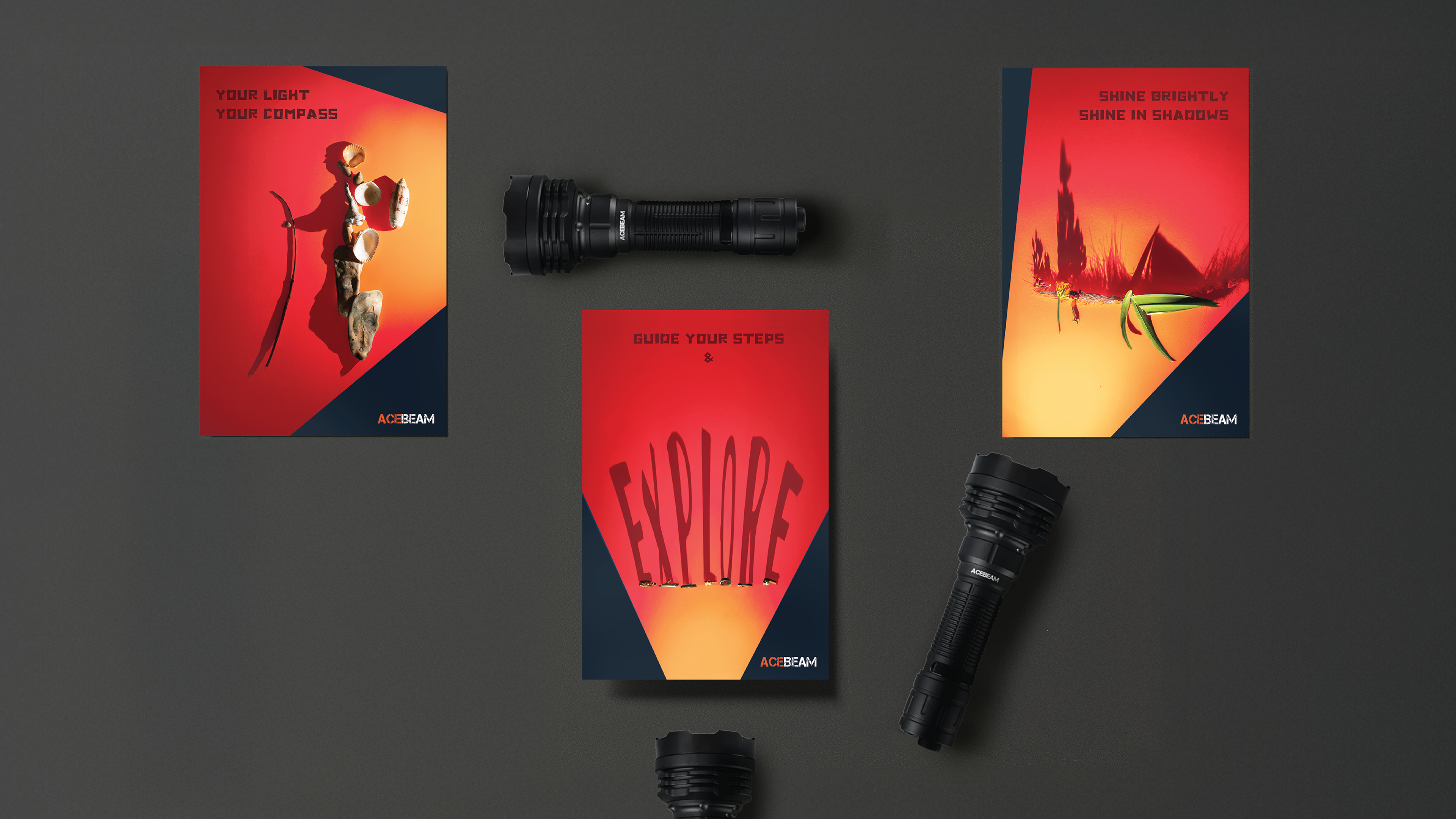 Gold ADDY-winning undergraduate campaign for Acebeam that harnesses light and shadow to create a compelling promotional narrative. This campaign utilizes the art of shadow painting, a technique in strategically arranging objects to cast precise and meaningful shadow compositions. These posters effectively highlight the power and precision of Acebeam’s lighting products, creating a visually striking and conceptually rich brand message. This project was developed using Adobe Illustrator and Lightroom to refine the imagery and enhance the overall design aesthetic.