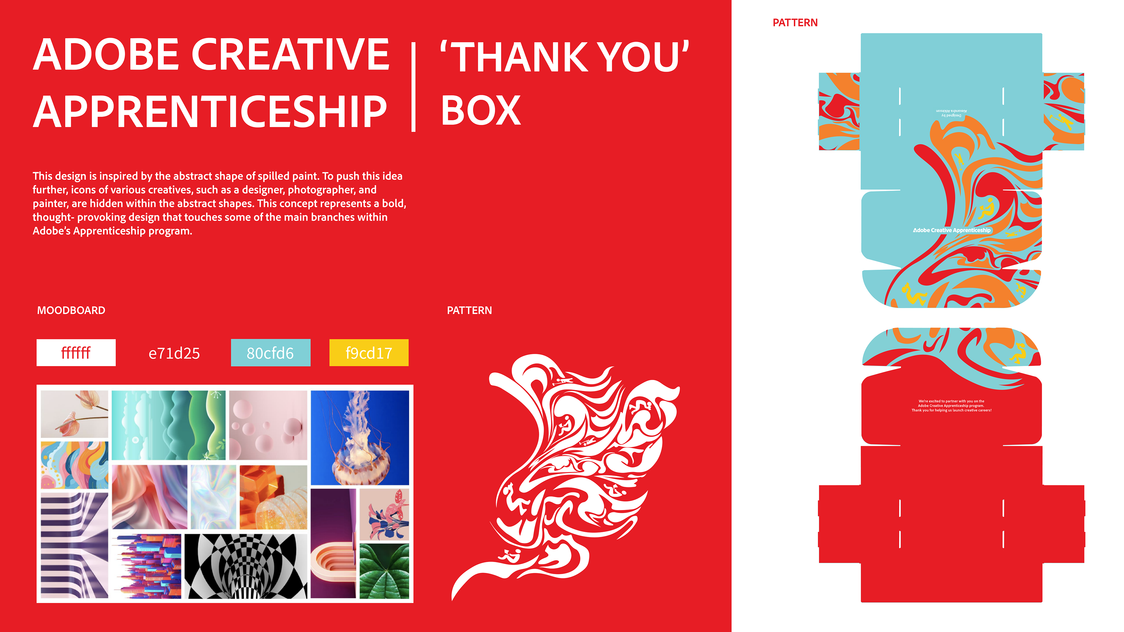 A commissioned project for the Adobe Creative Apprenticeship program.This design is inspired by the abstract shape of spilled paint. To push this idea further, icons of various creatives, such as a designer, photographer, and painter, are hidden within the abstract shapes. This concept represents a bold, thought- provoking design that touches some of the main branches within Adobe’s Apprenticeship program.