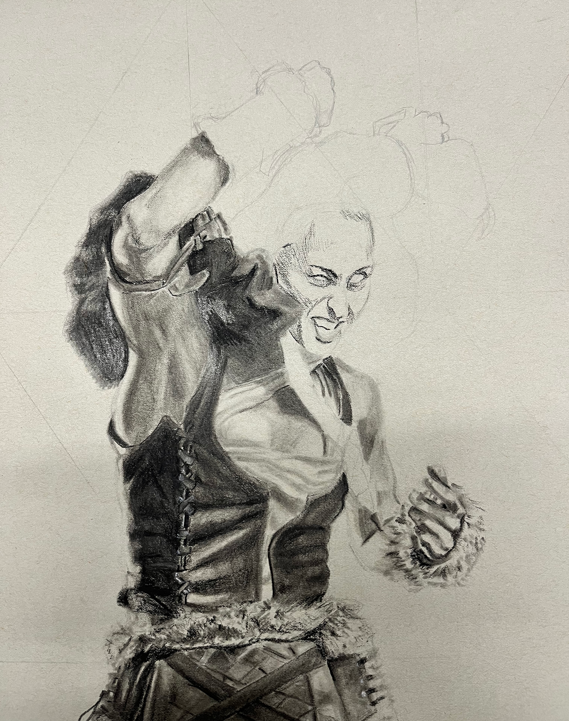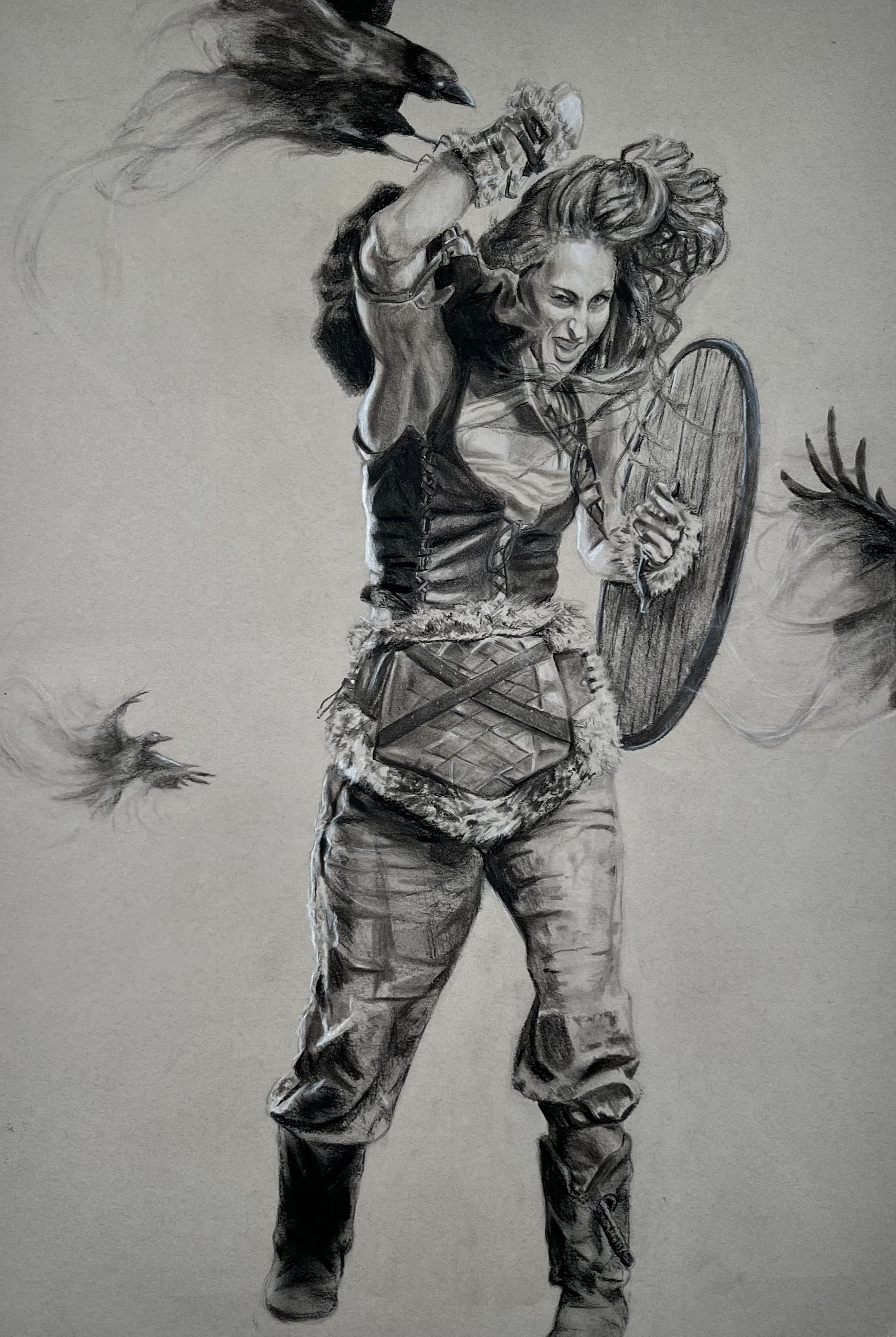 This illustration shows a Viking figure in motion, capturing a sense of strength and movement through its depth and shading. It was drawn entirely by hand with charcoal pencils: using white charcoal to suggest strong highlights. The texture of the medium adds a realistic effect that brings the energy and presence of the Viking to life.